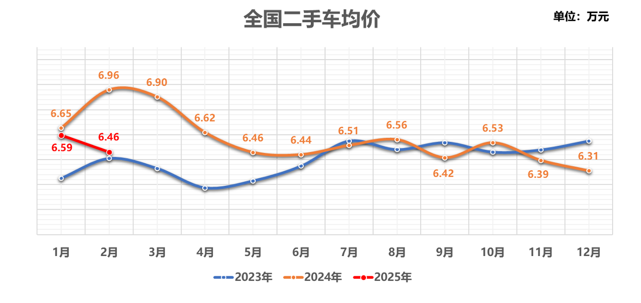 2月份,二手车交易均价为6.46万元,较1月份下降了0.14万元,较去年同期下降0.5万元。