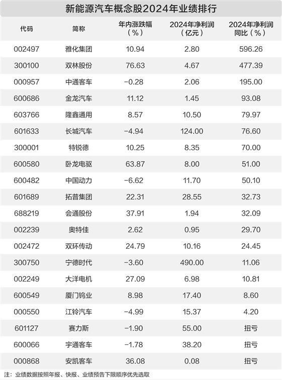 双林股份、中通客车2024年净利润同比增幅均超100%。双林股份表示,2024年全国新能源乘用车产销量大幅增长,报告期内公司新能源汽车相关业务实现快速增长,成为业绩提升的主要因素之一。金龙汽车、隆鑫通用、长城汽车、特锐德实现盈利,且同比预增幅度均超70%。
