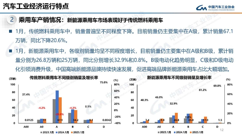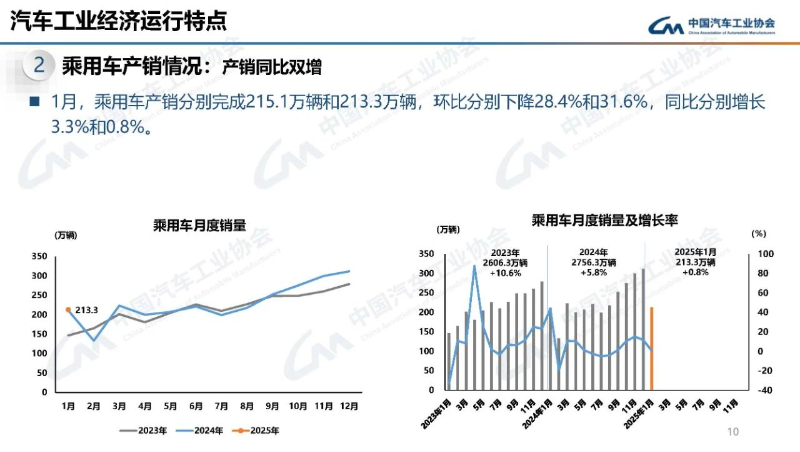 2月17日,中国汽车工业协会发布了2025年1月汽车工业产销情况据分析。分析显示,尽管1月有效工作日减少,但在“以旧换新”政策、春节经济助力等利好因素驱动下,汽车产量实现小幅增长,销量较同期只微降,行业迎来平稳开局。其中,乘用车延续良好表现,产销同比双增;新能源汽车产销和汽车出口延续良好表现。
