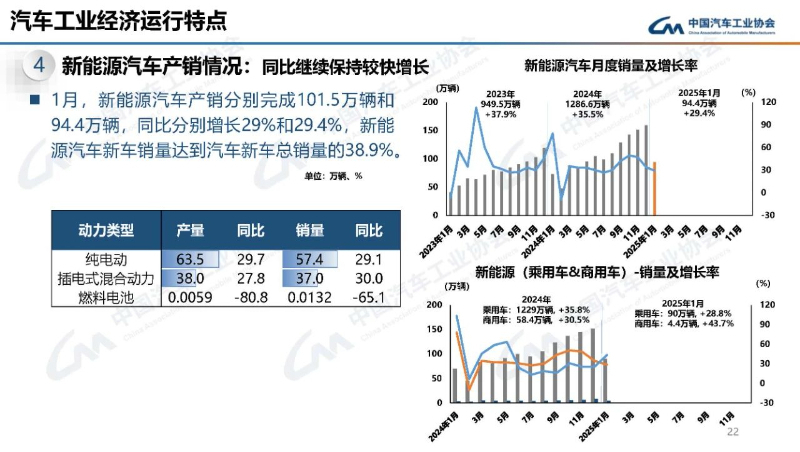 在新能源汽车方面,1月,新能源汽车产销分别完成101.5万辆和94.4万辆,同比继续保持较快增长,分别增长29%和29.4%,新能源汽车新车销量达到汽车新车总销量的38.9%。