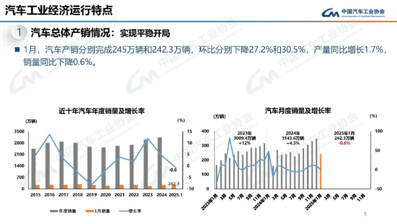 数据显示,1月,汽车产销分别完成245万辆和242.3万辆,环比分别下降27.2%和30.5%,产量同比增长1.7%,销量同比下降0.6%。