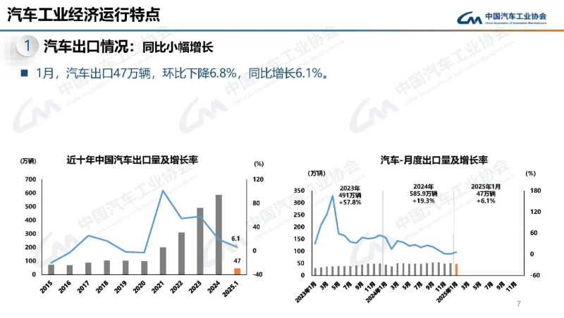 此外,关于汽车出口,1月,汽车出口47万辆,环比下降6.8%,同比增长6.1%。