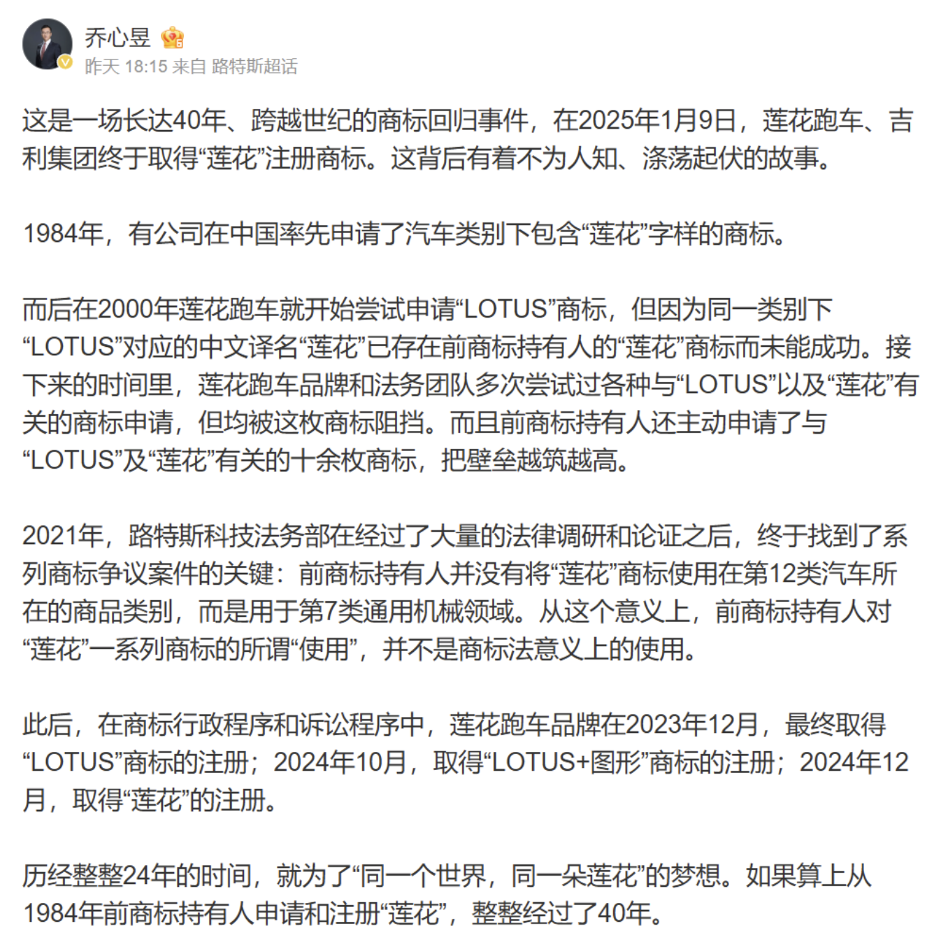 乔心昱称,2021年,路特斯科技法务部在经过了大量的法律调研和论证之后,终于找到了系列商标争议案件的关键:前商标持有人并没有将“莲花”商标使用在第12类汽车所在的商品类别,而是用于第7类通用机械领域。从这个意义上,前商标持有人对“莲花”一系列商标的所谓“使用”,并不是商标法意义上的使用。