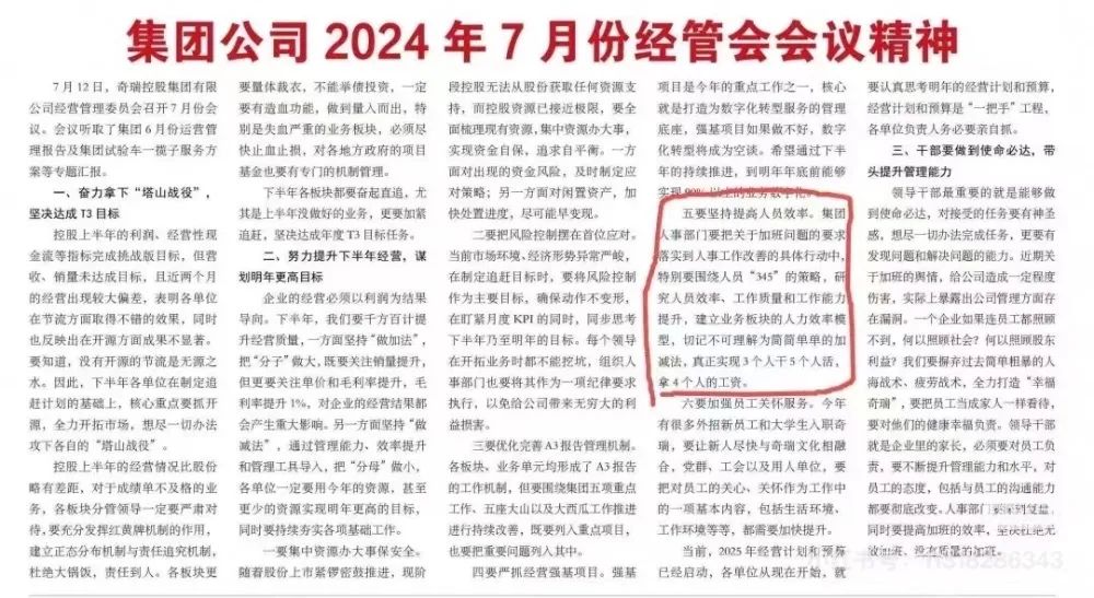 被曝“强制加班”一个月后,奇瑞一份7月内部经管会会议精神文件近日在网上流传,再度涉及人效管理相关内容。