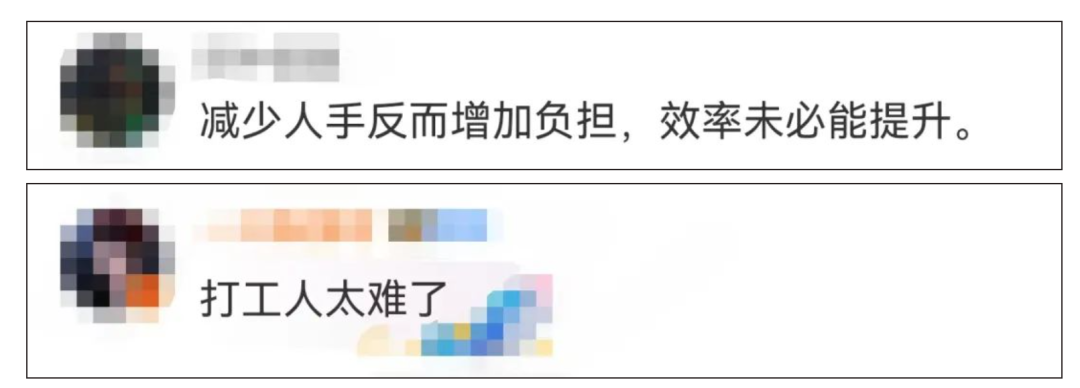 有网友评论称,“减少人手反而增加负担,效率未必能提升”“打工人太难了”。