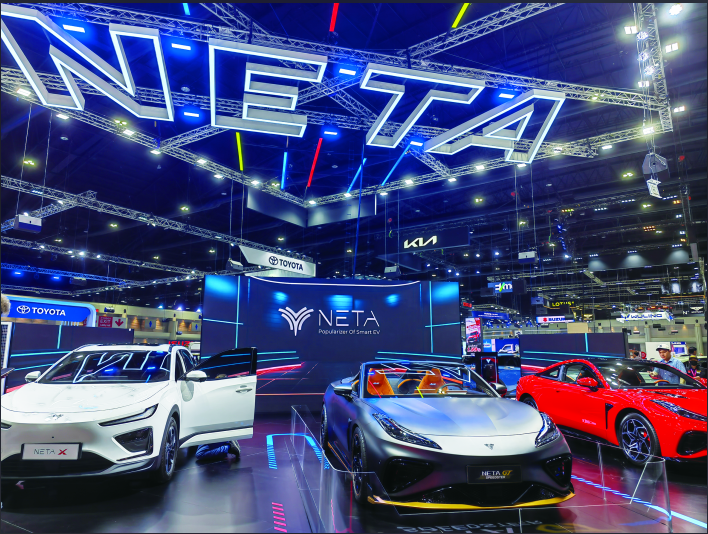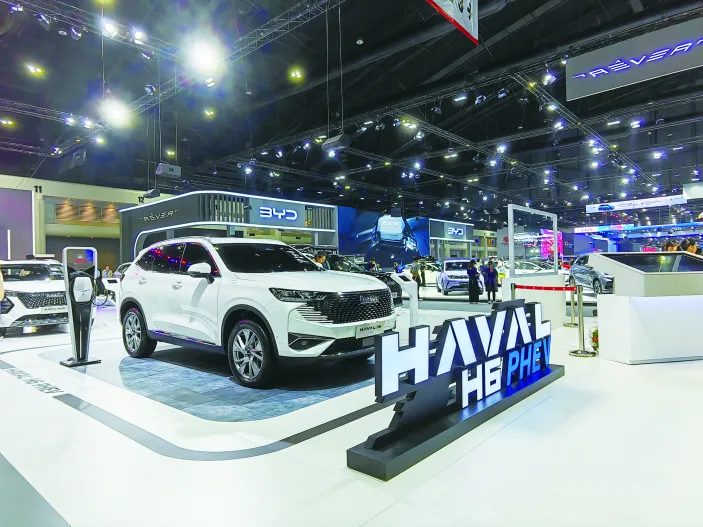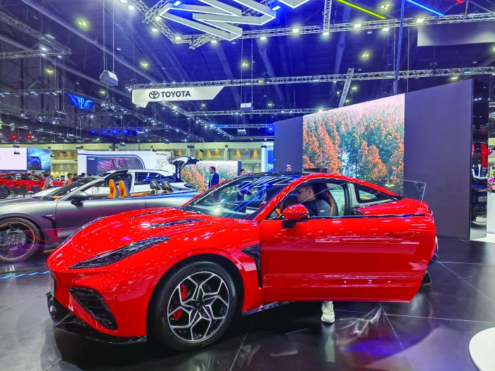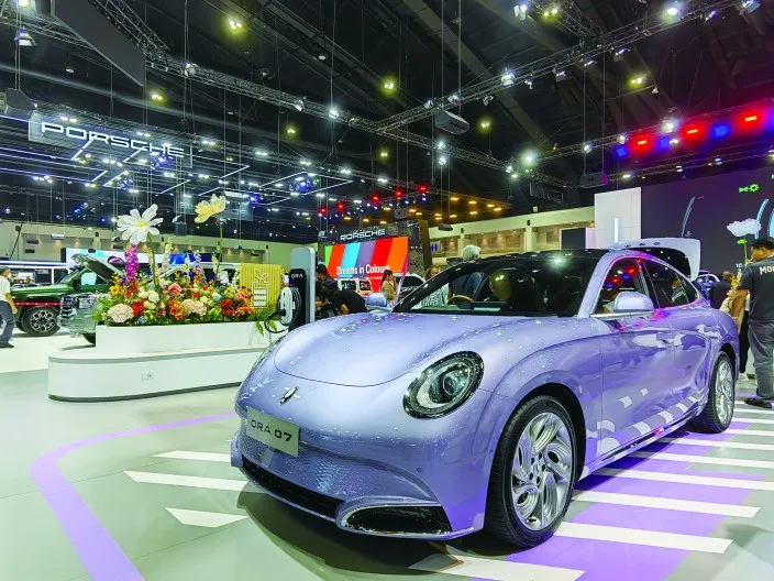 ▲2023年12月,在曼谷举办的泰国国际汽车博览会上,参观者在中国品牌新能源汽车展示区体验。杨一/摄