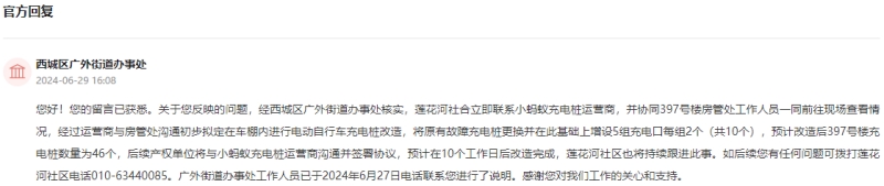 针对网友的建议,北京市西城区广外街道办事处回复称,得知情况后,居民小区所在的莲花河社区立即联系充电桩运营商,并协同房管处工作人员一起前往现场查看情况。