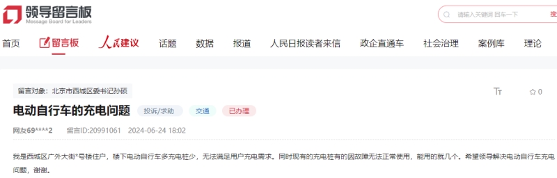 人民网北京7月4日电 (记者李博)近日,有北京网友通过人民网“领导留言板”留言称,自己居住的小区存在电动自行车充电难的问题,希望相关部门给予解决。