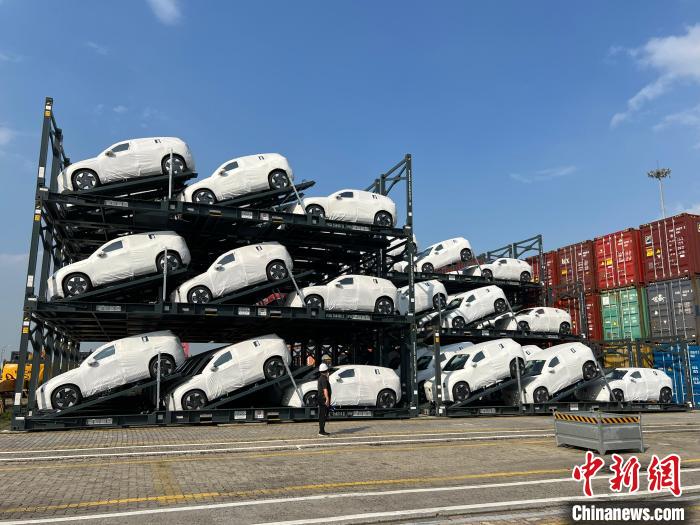 中新网记者看到,偌大的太仓国际集装箱码头上,停放着即将“登船”出口的崭新汽车,密密麻麻。一些车辆被装在特别设计的框架上,以增加空间使用效率。巨大的龙门吊林立江岸,卡车、船只不停地装卸货物,四面八方而来的运输车排起长队。