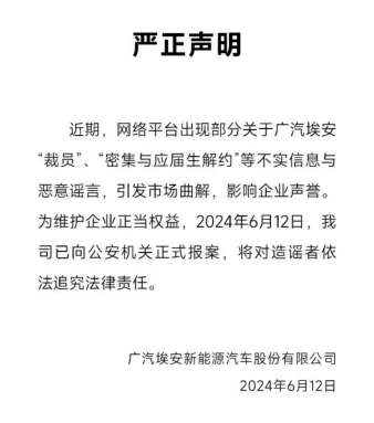 此前在6月12日,广汽埃安发布严正声明称:“近期,网络平台出现部分关于广汽埃安‘裁员’、‘密集与应届生解约’等不实信息与恶意谣言,引发市场曲解,影响企业声誉。为维护企业正当权益,2024年6月12日,我司已向公安机关正式报案,将对造谣者依法追究法律责任。”