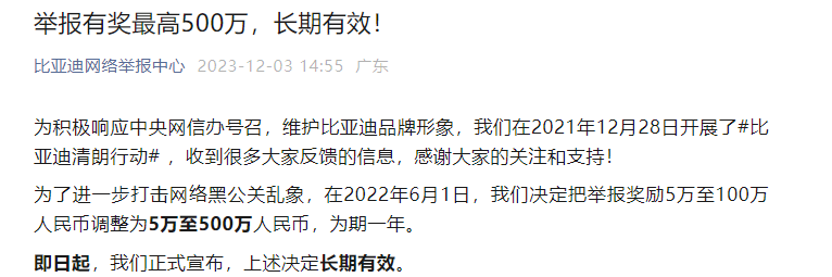 到了2023年,这一举报奖励制度被延续了下来。2023年7月24日,比亚迪法务部微博表示:“如果您还掌握其他涉嫌侵权、甚至涉嫌收受他人利益侵害比亚迪及比亚迪用户权益的信息,欢迎联系@比亚迪新闻打假办公室提供线索。凡经比亚迪查证属实并得到相关司法机关认可的,我们将依据价值给予5万元至500万元不等的人民币作为奖励。”2023年12月,比亚迪宣布,5万—500万元的举报奖励长期有效。