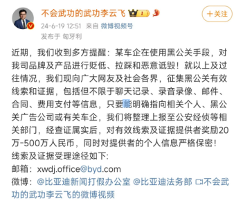 6月19日,微博认证为比亚迪集团品牌及公关处总经理的“不会武功的李云飞”发布微博称,近期某车企在使用黑公关手段,对比亚迪品牌及产品进行恶意诋毁。比亚迪向广大网友及社会各界征集黑公关有效线索和证据,经查证属实后,对有效线索及证据提供者奖励20万—500万元人民币,同时对提供者的个人信息严格保密。