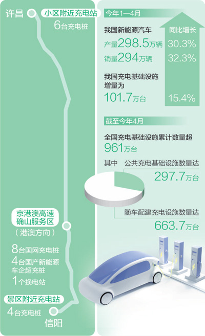 中国汽车工业协会数据显示,今年1—4月,我国新能源汽车产销量达298.5万辆和294万辆,同比分别增长30.3%和32.3%,市场占有率达32.4%。与新能源汽车普及推广相适应,我国新能源汽车充电保障不断完善。根据中国电动汽车充电基础设施促进联盟统计,今年1—4月,我国充电基础设施增量为101.7万台,同比增长15.4%;桩车增量比为1∶2.5。截至今年4月,全国充电基础设施累计数量超961万台,同比增长57.8%。