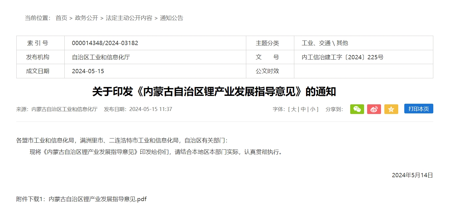 5月14日,内蒙古自治区工业和信息化厅发布《内蒙古自治区锂产业发展指导意见》。其中提到,到2025年,初步构建全区锂产业链,锂精矿产能达到5万吨/年(折碳酸锂当量),磷酸铁锂正极材料52万吨/年,负极材料176.4万吨/年,电解液3万吨/年,隔膜15亿平方米/年,电池29GWh/年,锂产业链产值达到700亿元。到2030年,形成较为完善的锂产业生态,技术创新能力显著增强,产业规模显著扩大、智能化绿色化达到全国先进水平,建成国家重要的锂产业基地,锂产业链产值突破2000亿元。