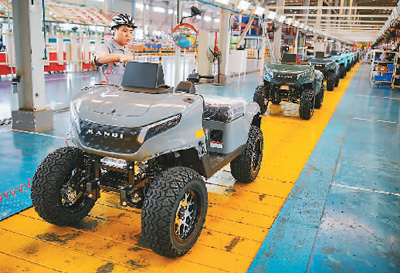 在海南海口国家高新区康迪电动汽车车间,工人在组装电动车。