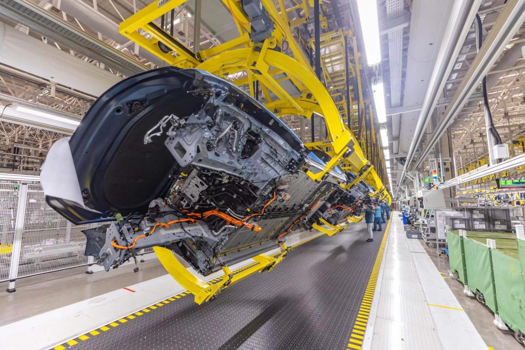 赛力斯汽车超级工厂内,工作人员在总装车间生产线上作业。新华社记者 黄伟 摄