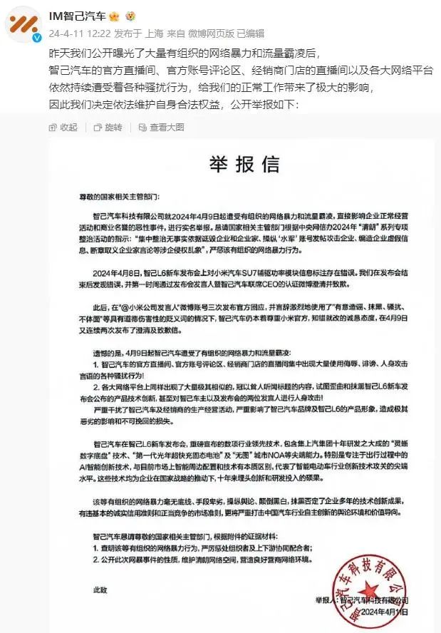 4月11日,智己汽车发布举报信称,公司就4月9日起遭受有组织的网络暴力和流量霸凌,直接影响企业正常经营活动和商业名誉的恶性事件,进行实名举报。