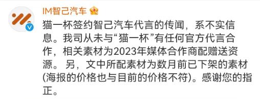 对此,智己汽车方面回应称,“猫一杯”签约智己汽车代言的传闻,系不实信息。我司从未与“猫一杯”有任何官方代言合作,相关素材为2023年媒体合作商配赠送资源。另,文中所配素材为数月前已下架的素材(海报的价格也与目前的价格不符)。