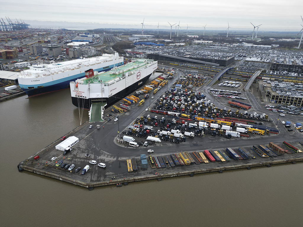 全球滚装运输行业正在努力恢复。图为2月,中国新能源汽车厂商比亚迪首艘汽车运输船停靠在德国不来梅哈芬港的场景。(视觉中国)