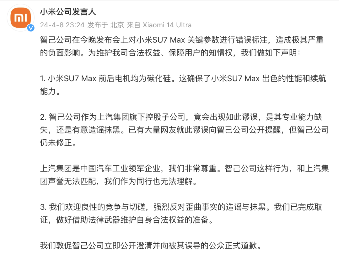 不过,小米并不买账,小米公司发言人随后连续发布微博,称智己公司在当晚发布会上对小米SU7 Max 关键参数进行错误标注,小米SU7 Max 前后电机均为碳化硅。小米公司发言人表示,已完成取证,督促智己公司立即公开澄清并致歉。