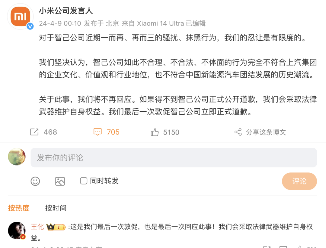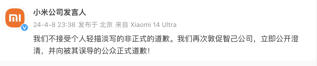 小米公司发言人还表示:“我们不接受个人轻描淡写的非正式的道歉。我们再次敦促智己公司,立即公开澄清,并向被其误导的公众正式道歉!”