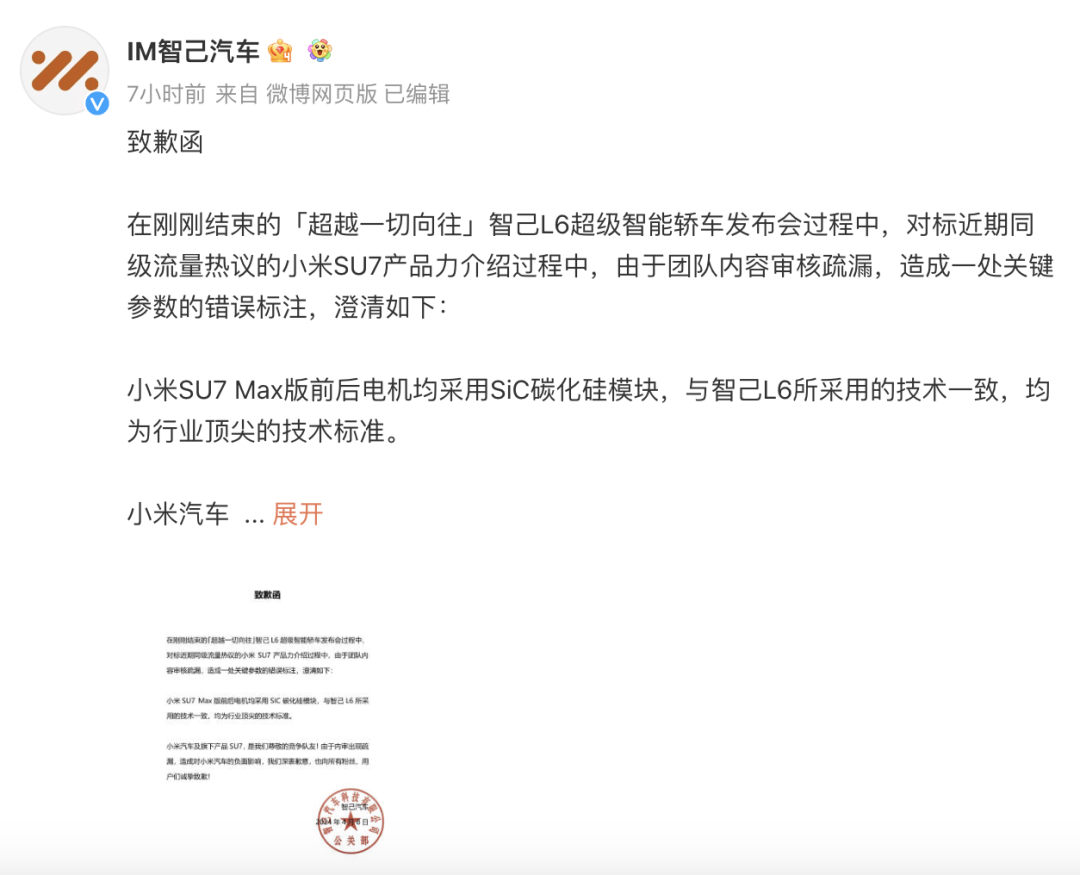 致歉函称,在智己L6超级智能轿车发布会过程中,对标近期同级流量热议的小米SU7产品力介绍过程中,由于团队内容审核疏漏,造成一处关键参数的错误标注。智己汽车澄清称,小米SU7 Max版前后电机均采用SiC碳化硅模块,与智己L6所采用的技术一致,均为行业顶尖的技术标准。