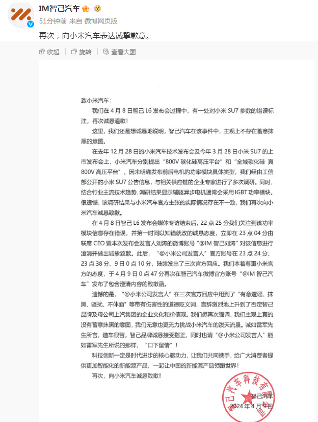 4月9日凌晨,智己汽车发布致歉函,对小米汽车造成的负面影响致歉。
