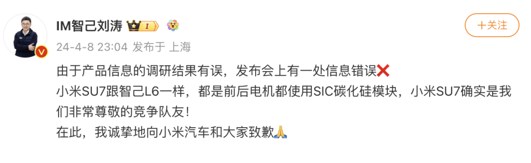 事情的起因是昨晚智己汽车对小米SU7 Max 关键参数进行错误标注,对此,智己汽车联席CEO刘涛发布微博向小米汽车致歉,称:“由于产品信息的调研结果有误,发布会上有一处信息错误,小米SU7跟智己L6一样,都是前后电机都使用SIC碳化硅模块。”