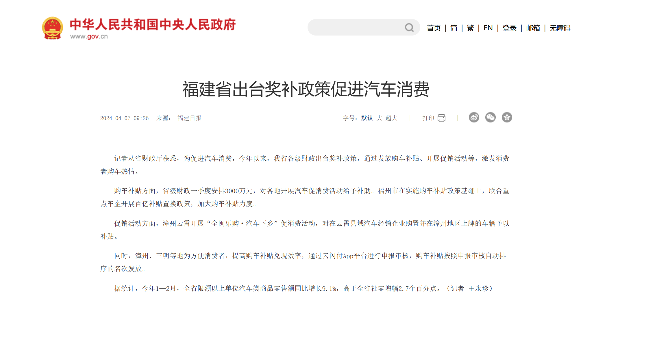 记者从福建省财政厅获悉,为促进汽车消费,今年以来,福建省各级财政出台奖补政策,通过发放购车补贴、开展促销活动等,激发消费者购车热情。