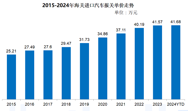 虽然汽车进口量逐年下滑,但进口车报关单价逐年提升。2015-2023年期间,进口车报关单价从25.21万元提升到41.68万元。对于价格上涨的原因,流通协会分析表示,一是疫情后国内消费升级,二是低价产品国产化导致中低端汽车进口量日益萎缩,三是汇率贬值。