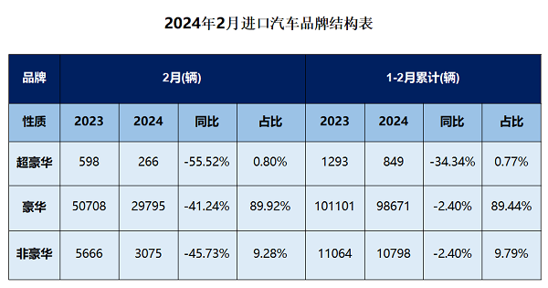 从品牌分类看,1-2月超豪华汽车累计下跌34.34%,豪华车和非豪华汽车销量累计下跌幅度均为2.4%。在销量占比上,豪华车仍是销量主力,1-2月累计占比达到89.44%。
