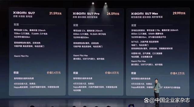 当然,雷军也确实给了大众一个远超预期的良心定价。小米为第一辆车SU7提供了三款配置,分别是小米SU7标准版,售价21.59万元;小米SU7 Pro版,售价24.59万元;小米SU7 Max版,售价29.99万元。