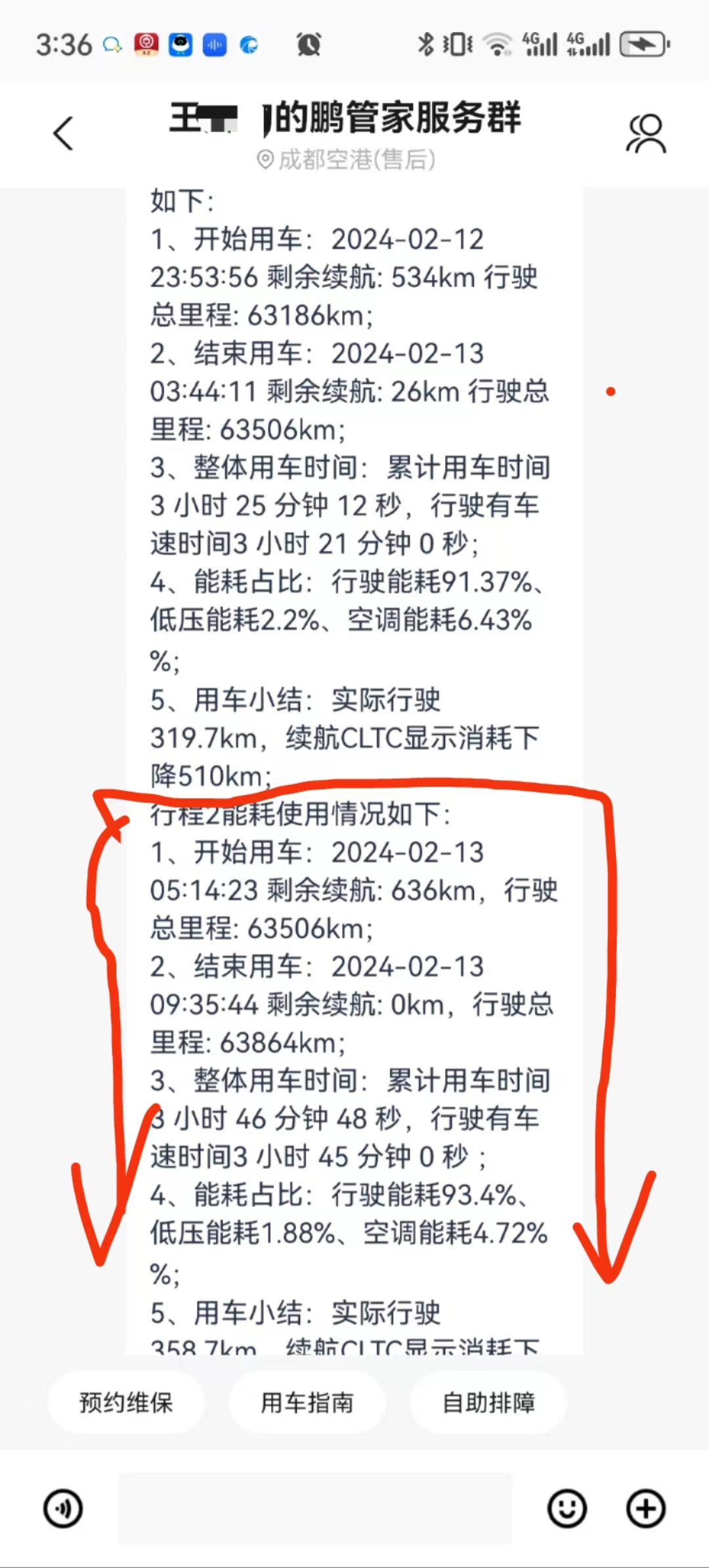 按照王先生提供的信息来看,其充电后剩余续航为636km,行驶总里程为63506km;结束用车时剩余续航0km,行驶总里程63864km,行驶有车速时间3小时45分钟,能耗占比情况是行驶能耗为93.4%,低压能耗为1.88%,空调能耗为4.72%。依据这些信息推算,王先生这段续航里程为358km(行驶总里程63864km-63506km)。“这么算下来,实际续航里程得打5.5折左右。”