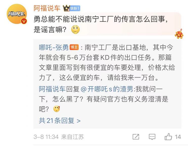 对于南宁工厂停摆事件,3月8日,张勇在社交平台微博发文表示,南宁工厂是哪吒汽车的出口基地,并且今年会有5万—6万台套KD件的出口任务。