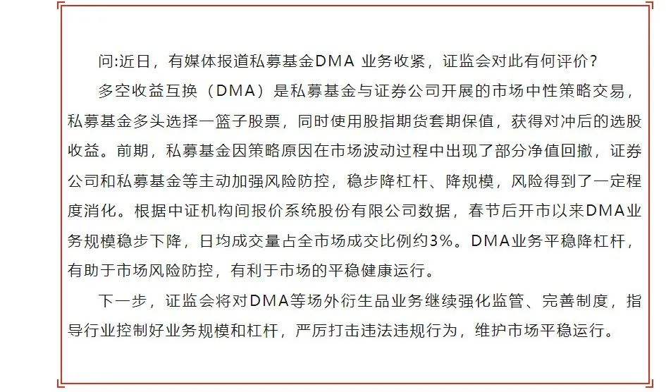 证监会表示,多空收益互换(DMA)是私募基金与证券公司开展的市场中性策略交易,私募基金多头选择一篮子股票,同时使用股指期货套期保值,获得对冲后的选股收益。前期,私募基金因策略原因在市场波动过程中出现了部分净值回撤,证券公司和私募基金等主动加强风险防控,稳步降杠杆、降规模,风险得到了一定程度消化。根据中证机构间报价系统股份有限公司数据,春节后开市以来DMA业务规模稳步下降,日均成交量占全市场成交比例约3%。DMA业务平稳降杠杆,有助于市场风险防控,有利于市场的平稳健康运行。