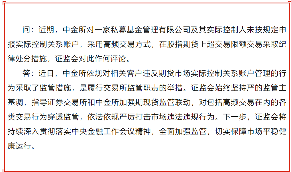 对此,证监会新闻发言人表示,近日,中金所依规对相关客户违反期货市场实际控制关系账户管理的行为采取了监管措施,是履行交易所监管职责的举措。证监会始终坚持严的监管主基调,指导证券交易所和中金所加强期现货监管联动,对包括高频交易在内的各类交易行为穿透监管,依法依规严厉打击市场违法违规行为。下一步,证监会将持续深入贯彻落实中央金融工作会议精神,全面加强监管,切实保障市场平稳健康运行。
