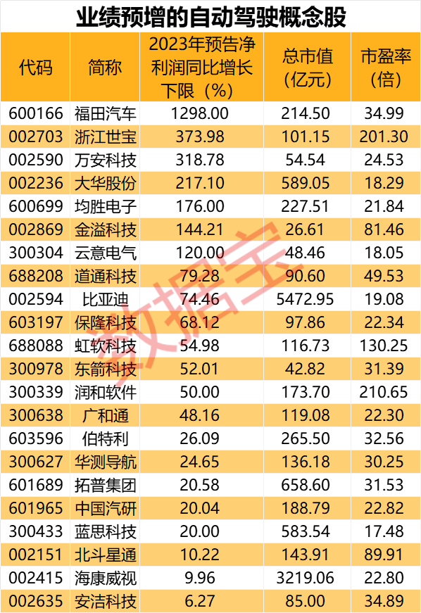 证券时报·数据宝统计显示,目前已有60只自动驾驶概念股发布2023年度业绩预告或业绩快报,其中9只预计扭亏,22只净利润预增,报喜比例约为五成。从预告净利润同比增长下限来看,7股预计净利润增幅在100%以上,福田汽车、浙江世宝、万安科技预计增幅居前。