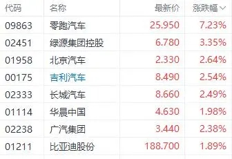 截至发稿,零跑汽车(09863.HK)、北京汽车(01958.HK)、吉利汽车(00175.HK)、长城汽车(02333.HK)分别上涨7.23%、2.64%、2.54%。