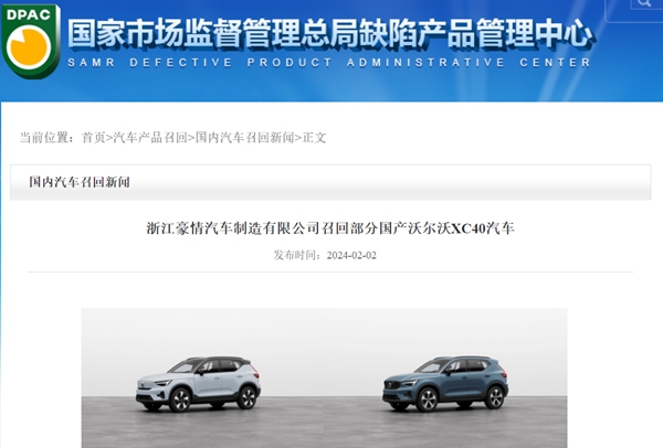 沃尔沃则将自公告发布日期,召回共计6608辆2023年3月10日至2023年12月20日生产的国产2024年款XC40汽车。
