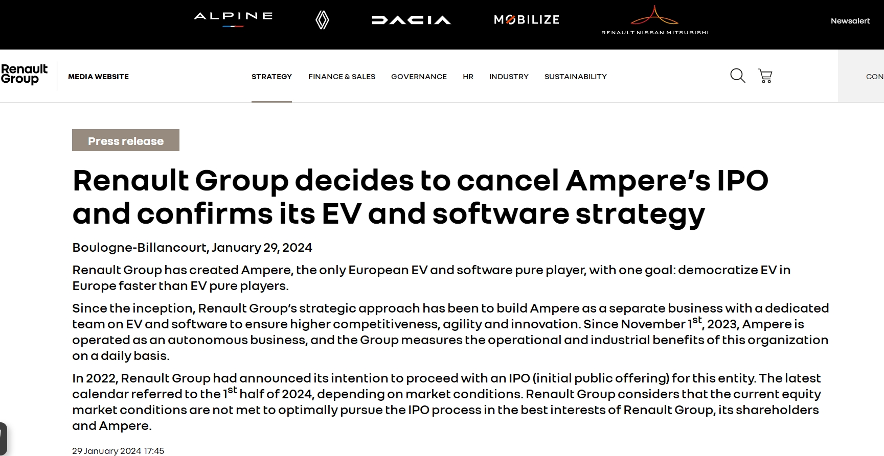当地时间1月29日,雷诺集团宣布,考虑到当前的股票市场状况和集团更强的现金产生能力,决定取消电动汽车子公司安培(Ampere)的IPO进程。