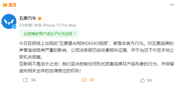 五菱汽车表示,“互联网不是法外之地!我们坚决抵制任何形式损害品牌及产品形象的行为,并保留追究相关主体的法律责任的权利”。