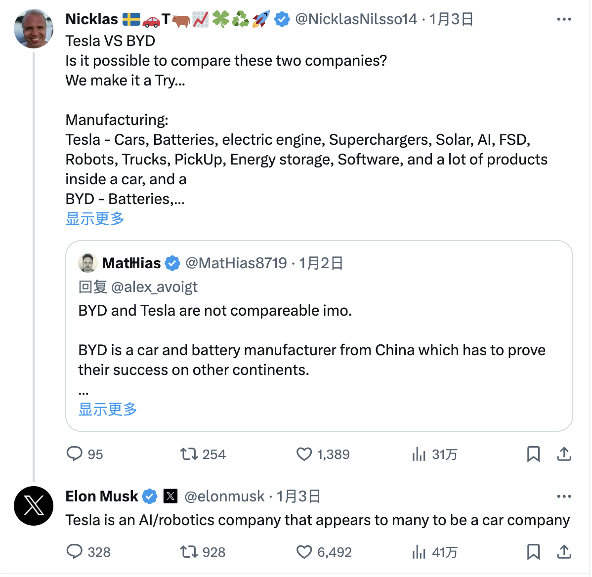 马斯克在X上回应网友对比特斯拉与比亚迪