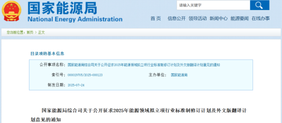 7月27日,国家能源局发布《关于公开征求2025年能源领域拟立项行业标准制修订计划及外文版翻译计划意见的通知》。