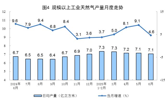 天然气生产稳定增长。6月份,规上工业天然气产量212亿立方米,同比增长4.6%,增速比5月份放缓4.5个百分点;日均产量7.1亿立方米。
