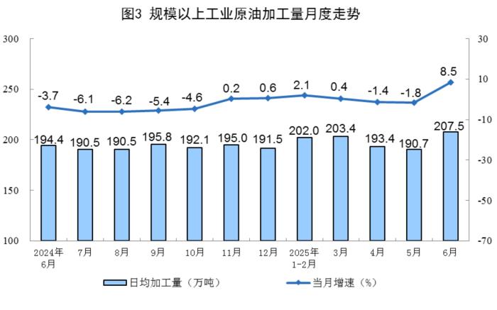 原油加工由降转增。6月份,规上工业加工原油6224万吨,同比增长8.5%,5月份为下降1.8%;日均加工207.5万吨。