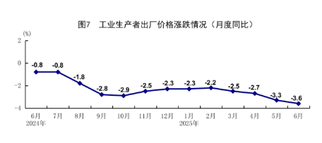 上半年,全国工业生产者出厂价格同比下降2.8%。其中,6月份同比下降3.6%,环比下降0.4%。上半年,工业生产者购进价格同比下降2.9%。其中,6月份同比下降4.3%,环比下降0.7%。
