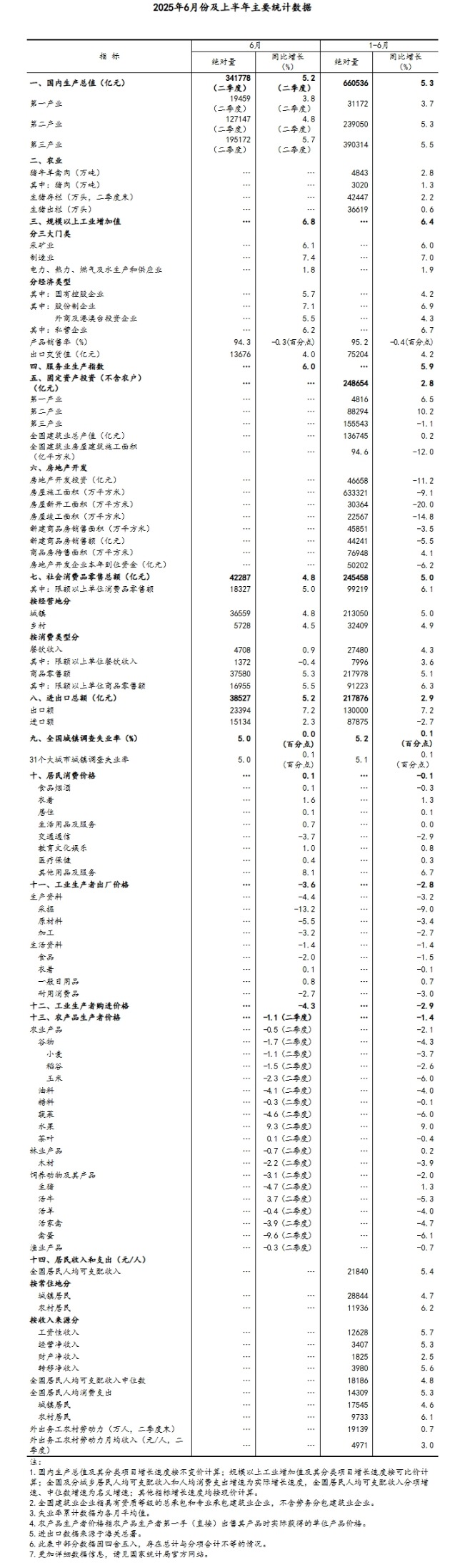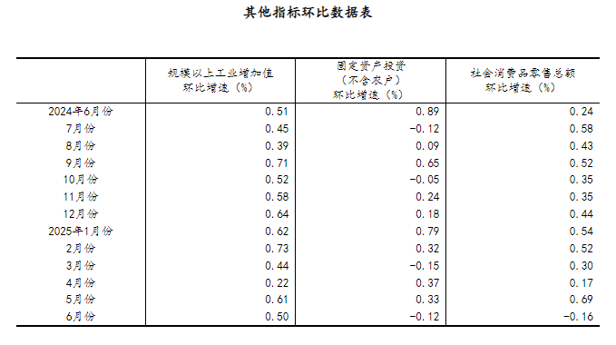 (2)根据季节调整模型自动修正结果,对近一年来各期国内生产总值、规模以上工业增加值、固定资产投资(不含农户)、社会消费品零售总额环比增速进行修订。修订结果及2025年二季度GDP环比数据、2025年6月份其他指标环比数据如下: