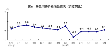 上半年,全国居民消费价格(CPI)同比下降0.1%。分类别看,食品烟酒价格下降0.3%,衣着价格上涨1.3%,居住价格上涨0.1%,生活用品及服务价格持平,交通通信价格下降2.9%,教育文化娱乐价格上涨0.8%,医疗保健价格上涨0.3%,其他用品及服务价格上涨6.7%。在食品烟酒价格中,鲜菜价格下降5.3%,粮食价格下降1.3%,鲜果价格上涨2.7%,猪肉价格上涨3.8%。6月份,全国居民消费价格同比上涨0.1%,环比下降0.1%。上半年,扣除食品和能源价格后的核心CPI同比上涨0.4%,比一季度扩大0.1个百分点。其中,6月份核心CPI同比上涨0.7%,比上月扩大0.1个百分点。