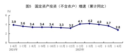 上半年,全国固定资产投资(不含农户)248654亿元,同比增长2.8%;扣除房地产开发投资,全国固定资产投资增长6.6%。分领域看,基础设施投资同比增长4.6%,制造业投资增长7.5%,房地产开发投资下降11.2%。全国新建商品房销售面积45851万平方米,同比下降3.5%;新建商品房销售额44241亿元,下降5.5%。分产业看,第一产业投资同比增长6.5%,第二产业投资增长10.2%,第三产业投资下降1.1%。民间投资同比下降0.6%;扣除房地产开发投资,其他民间投资增长5.1%。高技术产业中,信息服务业,航空、航天器及设备制造业,计算机及办公设备制造业投资同比分别增长37.4%、26.3%、21.5%。6月份,固定资产投资(不含农户)环比下降0.12%。