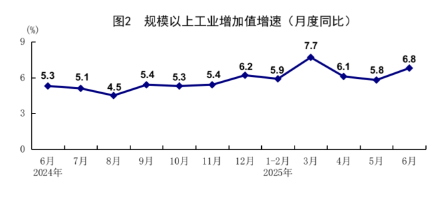 上半年,全国规模以上工业增加值同比增长6.4%。分三大门类看,采矿业增加值同比增长6.0%,制造业增长7.0%,电力、热力、燃气及水生产和供应业增长1.9%。装备制造业增加值同比增长10.2%,高技术制造业增加值增长9.5%,增速分别快于全部规模以上工业3.8和3.1个百分点。分经济类型看,国有控股企业增加值同比增长4.2%;股份制企业增长6.9%,外商及港澳台投资企业增长4.3%;私营企业增长6.7%。分产品看,3D打印设备、新能源汽车、工业机器人产品产量同比分别增长43.1%、36.2%、35.6%。6月份,规模以上工业增加值同比增长6.8%,环比增长0.50%。6月份,制造业采购经理指数为49.7%,比上月上升0.2个百分点;企业生产经营活动预期指数为52.0%。1-5月份,全国规模以上工业企业实现利润总额27204亿元,同比下降1.1%。